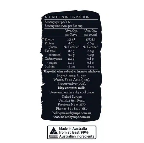 The Naked Syrups Liquid Sugar is made with real cane sugar and is the prefect buddy for cafes, restaurants, bars or mobile event stalls, one pump is one teaspoon. No stirring or mess! Can be used in hot coffees, iced coffees & cocktails/mocktails.